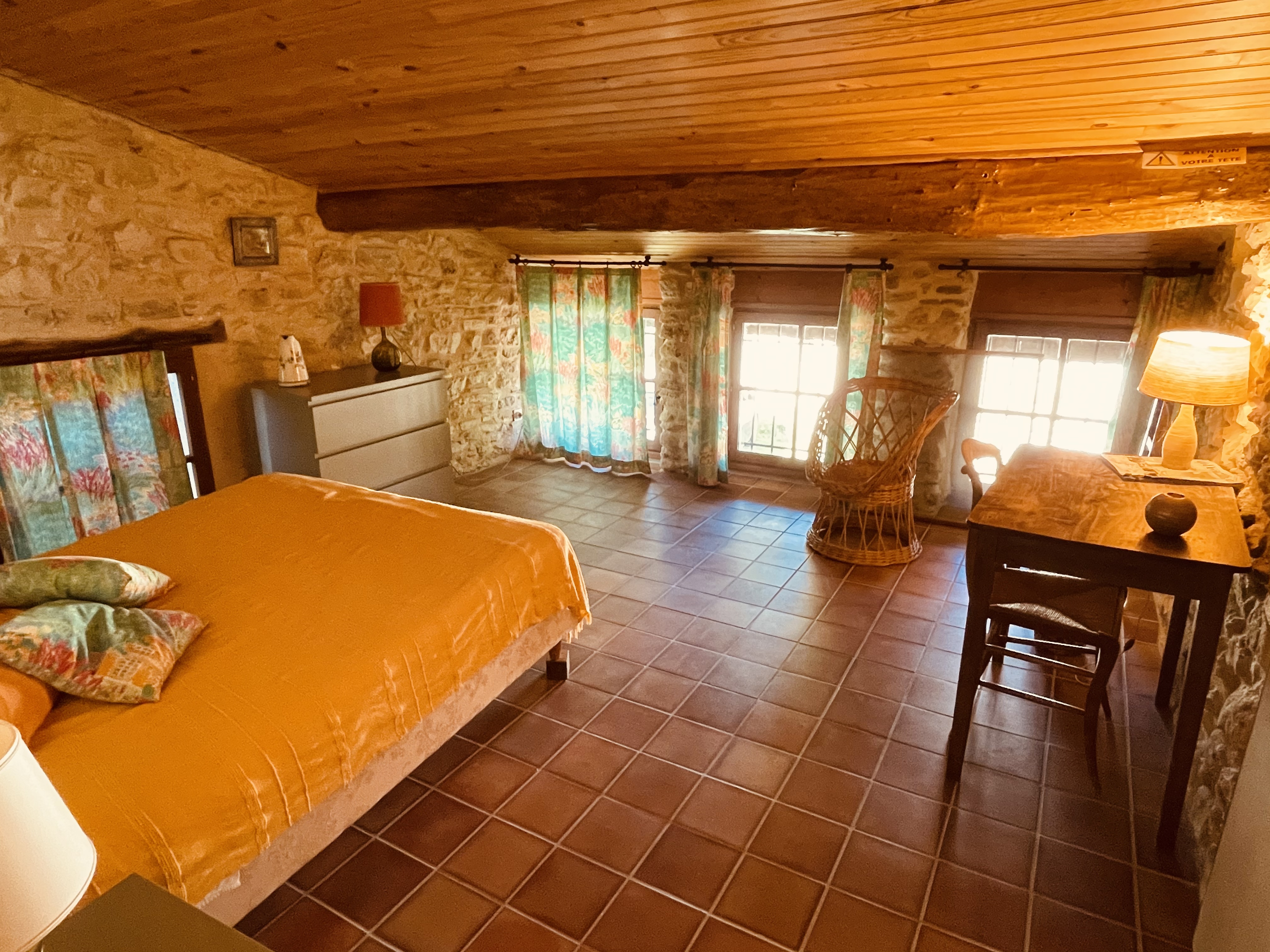 A l’étage : la chambre Larary mansardée avec lit double (140×190), salle de bains et toilette.